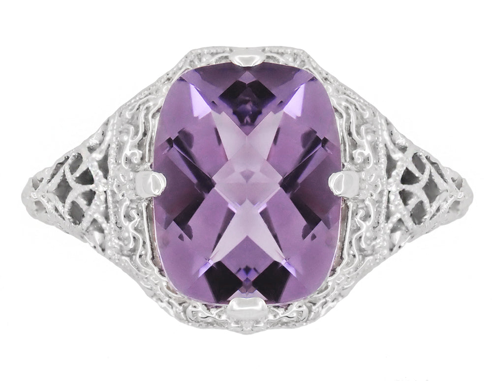 Art Deco Flowers and Leaves Cushion Cut Lilac Amethyst Filigree Ring in 14 Karat White Gold