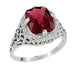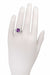 This beautiful vintage reissue amethyst solitaire ring is crafted in a delicate 14K white gold pierced filigree design and artfully finished with intricate carved flowers and leaves detailing.