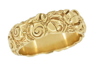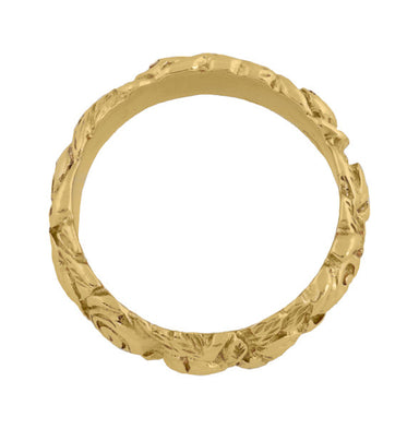 This appealing yellow gold antique style wedding ring features a delightful engraved leaves and flowers pattern all the way around the band, set ag...