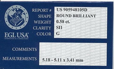 This ring comes with a diamond report for the center diamond from the European Gemological Laboratory (EGL).