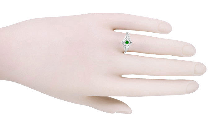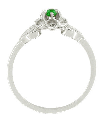 This timeless antique inspired Victorian floral emerald promise ring in white gold features a 0.15 carat natural green emerald ( May Birthstone ) a secure six prong floral setting, framed on the shoulders with elegant sculptural carved leaves.