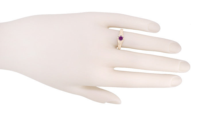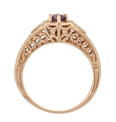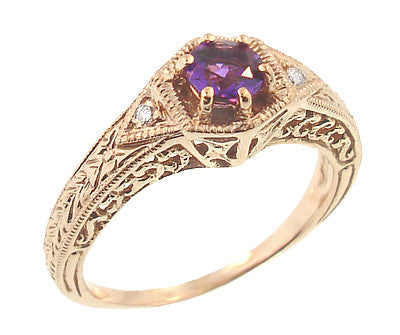 Art Deco Amethyst and Diamond Filigree Engraved Engagement Ring in 14 Karat Rose Gold