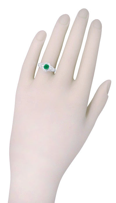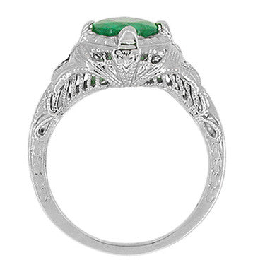 Art Deco Engraved Filigree Emerald Engagement Ring in 14 Karat White Gold