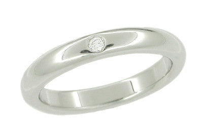 Circa 1990's, this heavy high polish platinum vintage wedding band by Tiffany designer Elsa Peretti is set with a shimmering 0.02 carat round brilliant cut diamond of E/F color and VS clarity. The "ELSA PERETTI PT950 TIFFANY & CO." hallmark is clearly visible on the inside of this gorgeous band. The clean modern design and comfortable fit of this wonderful platinum ring make it the perfect choice to wear for a lifetime. Measures 2.9 millimeters wide and is a size 4 1/2.