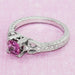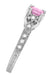 Measuring 6.2 millimeters wide, this lovely ring tapers down to 1.8 millimeters wide at the bottom of the ring and sits 3/16 inch off the finger. Timeless and unique, this platinum vintage inspired pink sapphire engagement ring is sure to be cherished.