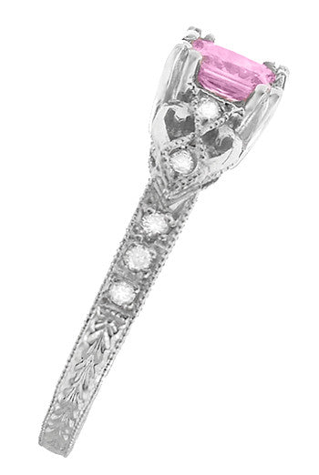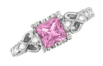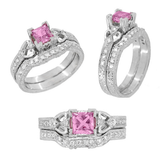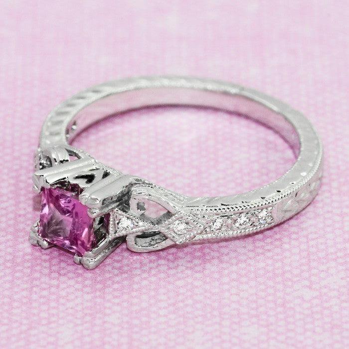 Loving Hearts Art Deco Antique Style Engraved Princess Cut Pink Sapphire Engagement Ring in 18 Karat White Gold
