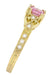 Timeless and unique, yellow gold vintage style pink sapphire engagement ring ( September Birthstone ) features a low profile design with romantic hearts on all 4 sides, and wheat engraving on the outside of the band framed with shimmery beaded millgrain edges for the perfect finishing touch!