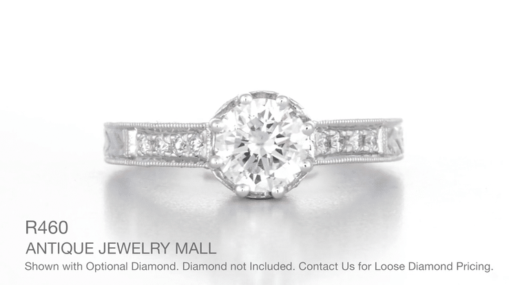This hand finished vintage-inspired ring semimount for a 3/4 carat diamond features a very secure 8 prong setting for the center stone, with 4 round brilliant cut diamonds set into the crown, and 4 round brilliant diamonds on each side of the center.
