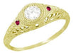 Art Deco Engraved Filigree Diamond Engagement Ring with Side Rubies in Yellow Gold