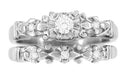 This stunning vintage inspired Retro Moderne white sapphire bridal ring set, faithfully reproduced from a 1950's Mid-Century vintage engagement and wedding band matched pair, features a galaxy of white sapphire stars!