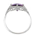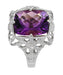 The amethyst measures 10 millimeters long by 8 millimeters wide, and the entire ring design measures 1/2 inch high by 11/16 inch wide, with the measurements of the band a comfortable 1.8 millimeters wide.