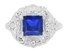 Detailed filigree floral engraving frames the vibrant princess cut blue sapphire, which is securely set into a "v" corner setting to protect the corners of the stone. Carved scrollwork and filigree around the sides of the ring complete the alluring design.