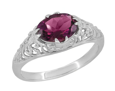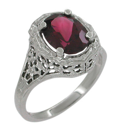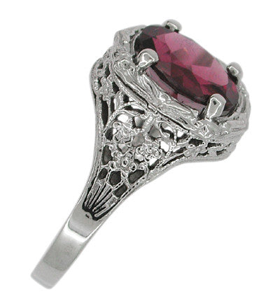 This beautiful vintage inspired Edwardian filigree rhodolite garnet engagement ring in white gold features an oval natural rose red rhodolite garne...