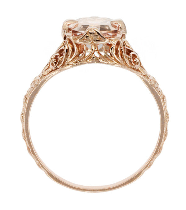 A lovely frame of gracefully detailed filigree openwork on all 4 sides of the ring is the perfect complement to the rare natural deep peach-pink morganite gemstone of 1.39 carat, with engraved flowers down the sides of the band. The classic low profile heirloom ring design makes this special engagement ring easy to wear and enjoy.