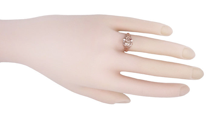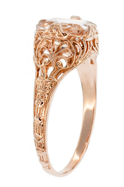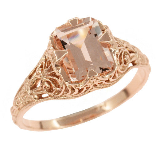 Edwardian Emerald Cut Morganite Engagement Ring in 14K Rose Gold Filigree