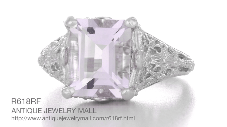 At its center is a lovely emerald cut natural pale pink rose de france amethyst ( February Birthstone ) of 2.40 carats. The ring setting measures 10.5 millimeters wide by 11.4 millimeters long and sits 6 millimeters (1/4 inch) off the finger.