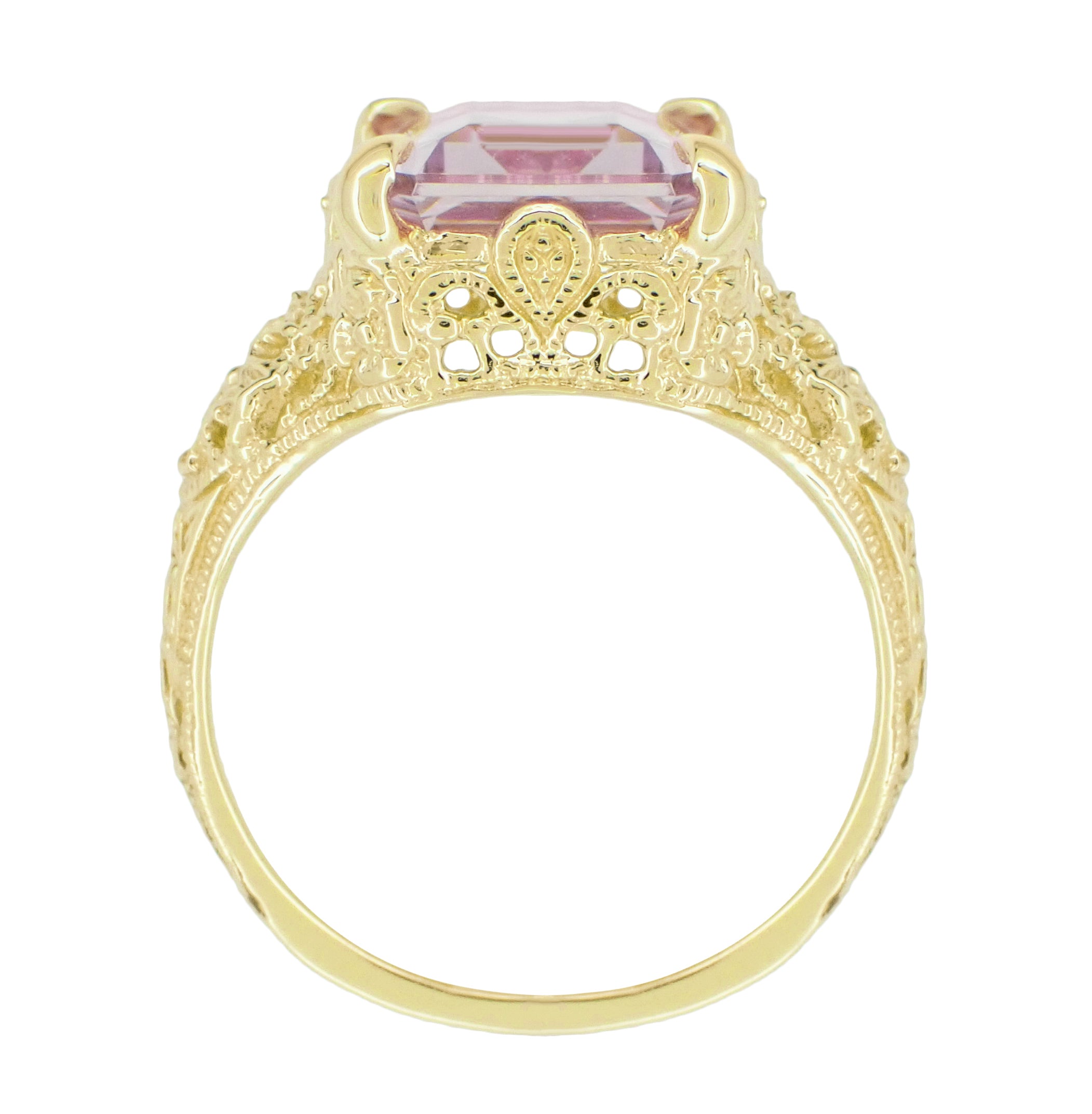 An exact hand finished reproduction of an original antique ring, the beautiful floral filigree openwork in warm 14K yellow gold perfectly frames the rectangular emerald cut rose de france amethyst ( February Birthstone ) of 2.40 carats.