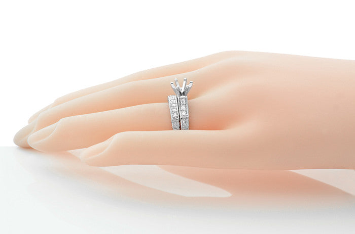 Art Deco Engraved Scrolls 1 Carat Round Diamond Engagement Ring Setting and Wedding Ring Bridal Set in White Gold