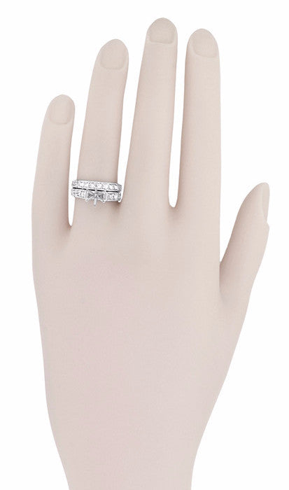 Crafted to order in your choice of 14K or 18K white gold, you can create your own custom antique engagement ring design by adding a certified 1 carat round diamond above, or purchase the rings as shown with no center stone, to have your jeweler set your stone.