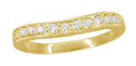 Crafted to order in your choice of 14K or 18K yellow gold, with your selection of natural diamonds or lab created diamonds, this lovely Art Deco yellow gold contoured wedding ring is designed to fit around our curved engagement ring styles, and with its slight curve also looks attractive when worn alone. Measures 2.4 millimeters wide.