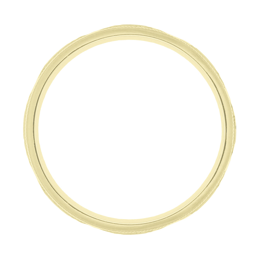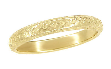 Measuring 2.5mm wide, this classic yellow gold vintage style wedding band is crafted for you by our jewelers to order, in your choice of 10K, 14K, or 18K yellow gold, and coordinates well with thin vintage engagement rings with milgrain and flowery carved patterns.