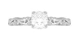 Hand crafted in 14K white gold, this lovely Art Deco solitaire engagement ring features a shimmering round brilliant cut 0.45 carat natural white sapphire ( September Birthstone ), securely 4 prong set in a classic fishtail setting atop a romantic three-dimensional sculptural carved scroll pattern band with a high polish finish.