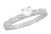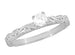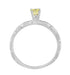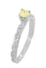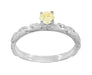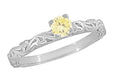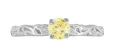 A wonderful alternative to a white diamond ring, this lovely Art Deco fancy yellow diamond solitaire engagement ring in white gold features a beautiful 0.23 carat EGL certified natural fancy yellow diamond. The sunny yellow diamond sits in a secure 4 prong fishtail setting atop a romantic three-dimensional engraved vintage scroll pattern band with a high polish finish.