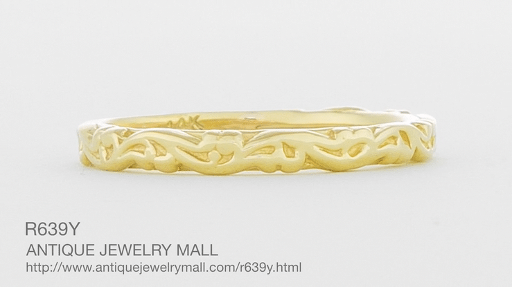 This yellow gold Art Deco vintage design wedding band is perfect to be worn alone, and can also be worn as a stackable band with gold rings of the same design in other gold metal colors. This pretty, versatile band has a small plain area at the bottom of the band, allowing for easy future resizing if ever needed.