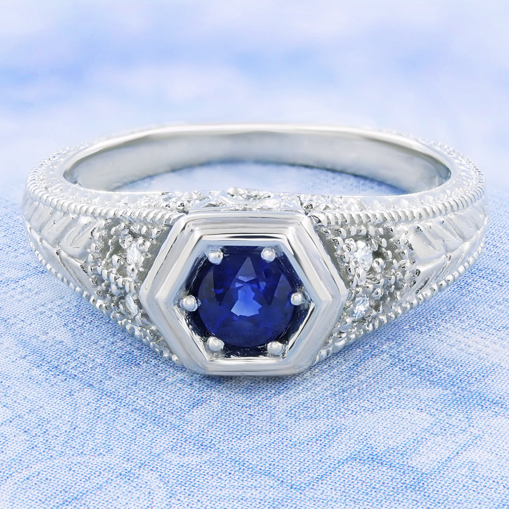 The heirloom design of this low profile ring makes it an excellent wearable choice for anyone who would like a traditional vintage sapphire engagement ring design with plenty of antique detail, which will not "catch" on things and get in the way of a busy daily routine. The perfect symbol of your love, this wonderful sapphire ring is sure to be cherished for generations to come.