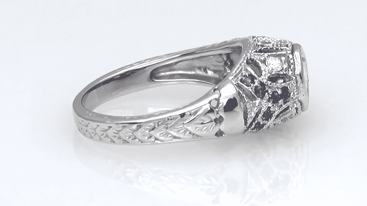 Set into the filigree gallery and sides of the ring are 14 blue sapphires ( September Birthstone ) for a total of 0.22 carat in blue sapphire accent stones, and 4 round brilliant cut diamonds of F/G color and VS clarity for a total of 0.08 carat side diamond weight. Total diamond weight for the entire ring including the center diamond is 0.34 carat.