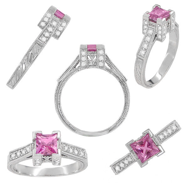 Art Deco 3/4 Carat Princess Cut Pink Sapphire and Diamond Platinum Engagement Ring - September Birthstone