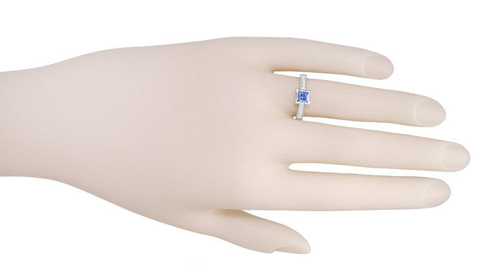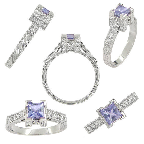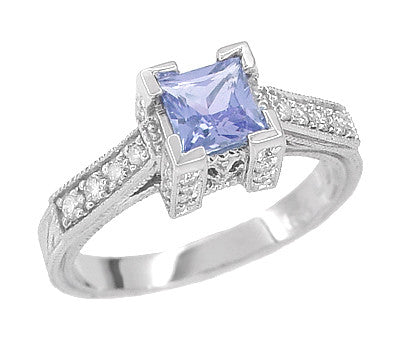 Art Deco 3/4 Carat Princess Cut Tanzanite and Diamond Engagement Ring in 18 Karat White Gold