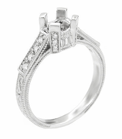 Art Deco Engraved Filigree Citadel Castle 1 Carat Diamond Engagement Ring Mounting in White Gold