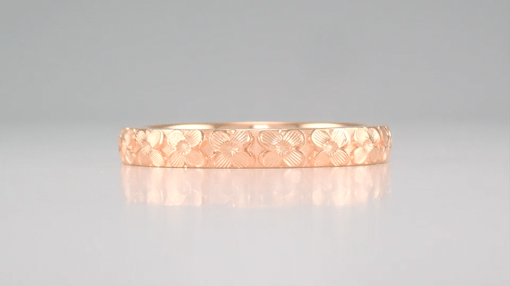 Artisan made to order, this lovely must-have rose gold floral wedding ring measures 3 millimeters wide.