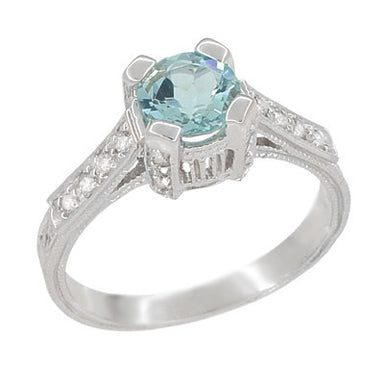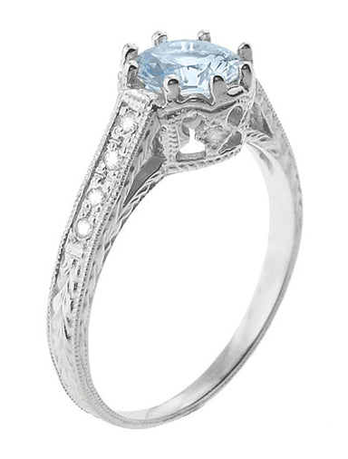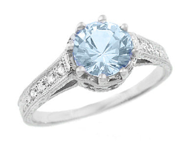 The ornate engraved filigree citadel setting at the center of this classic aquamarine engagement ring, is adorned with 12 round brilliant cut diamonds, and framed on each side with 4 round brilliant cut diamonds embedded into the top of the band. Total count of round brilliant full cut diamonds in this ring is 20, of VS clarity and F/G color, with the total diamond weight for the ring without the center aquamarine stone of 0.20 carat.