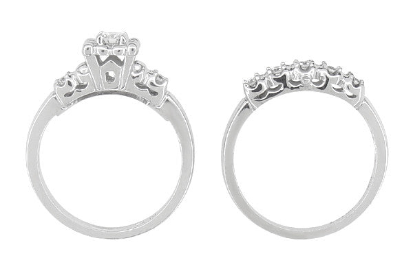 The companion 14K white gold wedding band features five shimmering round brilliant cut white sapphires, securely 4 prong set into the high polish hand finished design, for a total weight of 0.16 carat for the wedding ring. This classic wedding ring features a side peg which securely attaches this ring to the engagement ring so that the rings will match up, fit together properly, and not slide apart when on your finger.