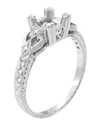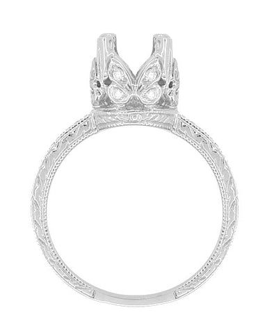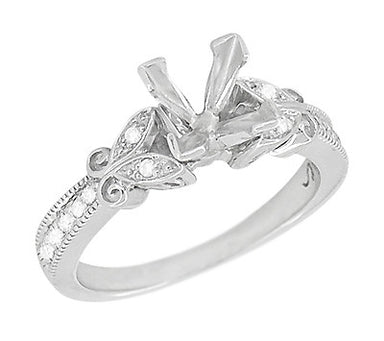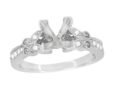 Lavishly detailed and meticulously hand crafted to order in your choice of 14K or 18K white gold for a for round stone of 6.2 to 7.3mm, this antique style engagement ring setting is decorated on the band with a classic engraved wheat pattern. Delicate pierced filigree, milgrain edging, bows, and diamond set flowers decorate this elegant ring setting, embedded with shimmering white round brilliant cut diamonds.
