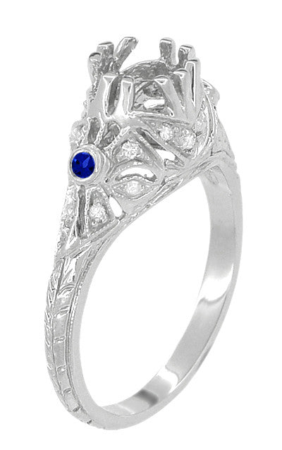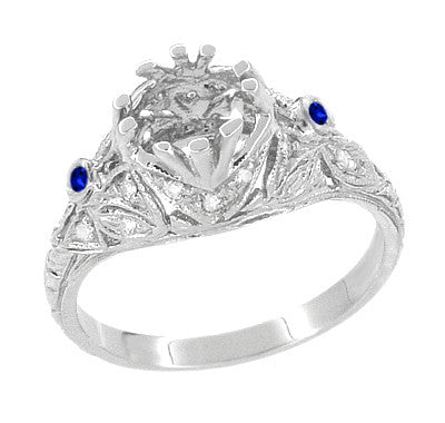 Edwardian Carved Platinum Round Stone Engagement Ring Mounting with Side Sapphires and Diamonds