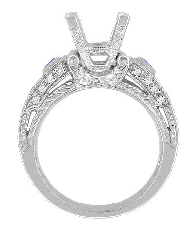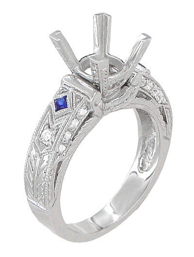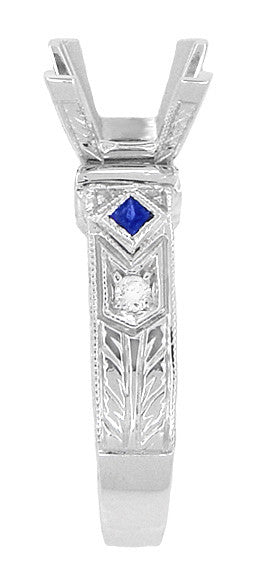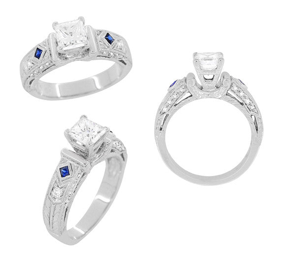 Art Deco 1 1/2 Carat Princess Cut Diamond Wheat Engraved Engagement Ring Setting in 18 Karat White Gold with Diamonds and Princess Cut Sapphires