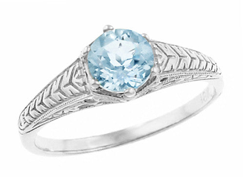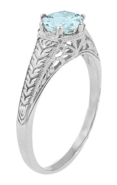 Art Deco Engraved Scrolls and Wheat Aquamarine Solitaire Engagement Ring in 18 Karat White Gold | 1920's Vintage Design