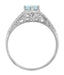 This 18 karat white gold aquamarine engagement ring measures 7.2 millimeters wide at the top of the ring, tapering down to 1.8 millimeters at the bottom of the band, and rises 6.5 millimeters off the finger. This 1920's ring design features a flush low profile prong setting style which makes it an excellent choice for anyone who would like an heirloom quality engagement ring with plenty of antique detail, which will not easily "catch" on things and get in the way of a busy daily routine.