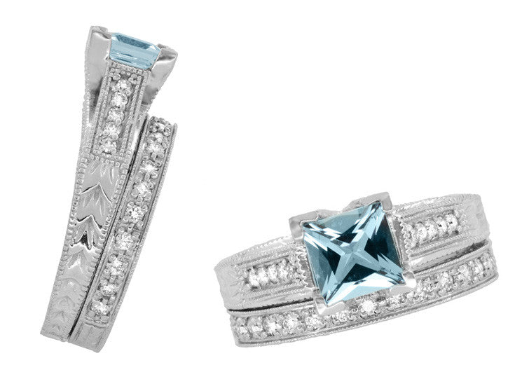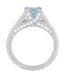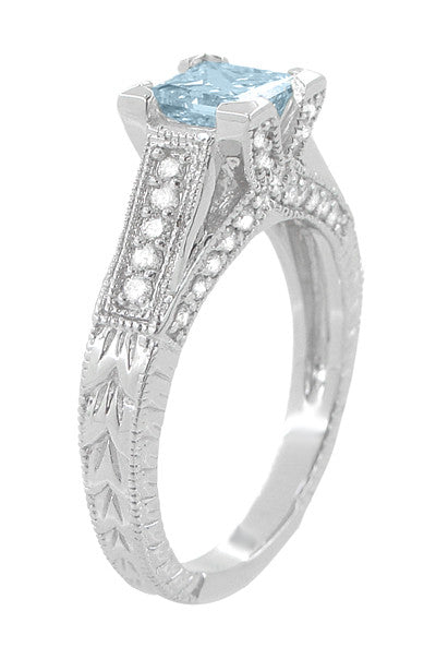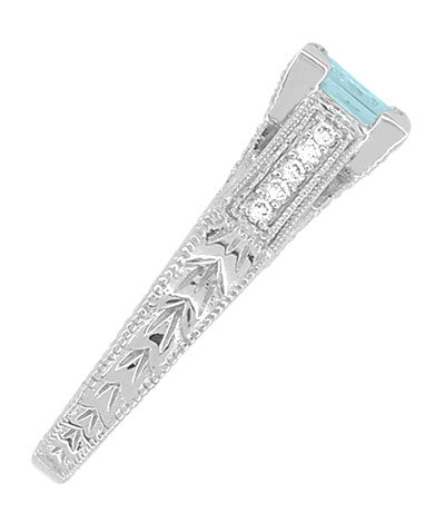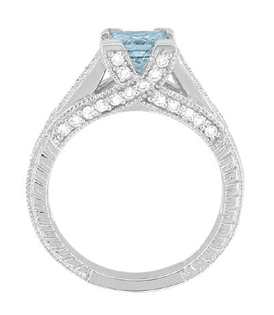 Measuring 6.5 millimeters wide at the top of the ring, and tapering down to 2.6 millimeters wide at the bottom of the band, it sits 1/4 inch off the finger. The perfect symbol of your eternal love, this gorgeous heirloom quality aquamarine engagement ring is certain to be treasured.