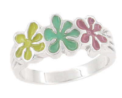 1960's Mod Enameled Flowers Ring in 14 Karat White Gold