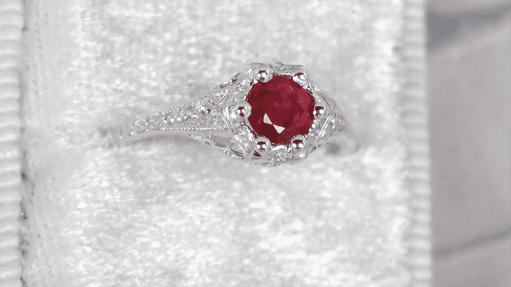 Art Deco Filigree Flowers Ruby Engagement Ring in 14 Karat White Gold