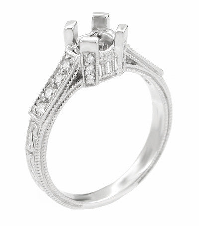 A detailed filigree castle setting at the center of the ring is embedded with 12 shimmering securely four prong set round brilliant full cut diamonds, and this palladium filigree engagement ring will accommodate an approximately 1/3 carat round brilliant cut or asscher cut diamond.