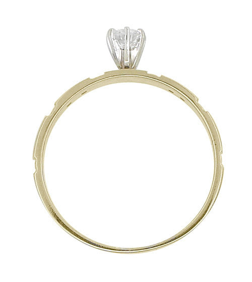 This classic diamond engagement ring features a flat band with geometric carved details as the perfect complement to the center 0.15 carat round brilliant cut diamond. The diamond is set in a secure 6 prong setting, framed with 2 old single cut accent diamonds on each side for added shimmer that's sure to be noticed.