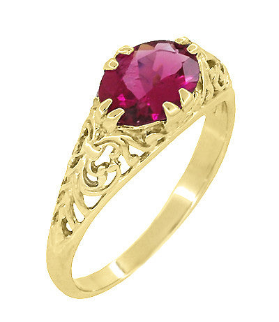 This gorgeous original antique inspired Edwardian rubellite tourmaline engagement ring in yellow gold is a breathtaking replica heirloom ring design, hand finished with delicate filigree scrollwork and timeless fleur-de-lys sculptural accents along the shoulders.