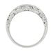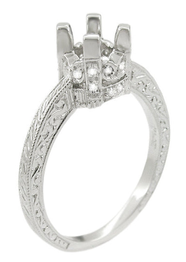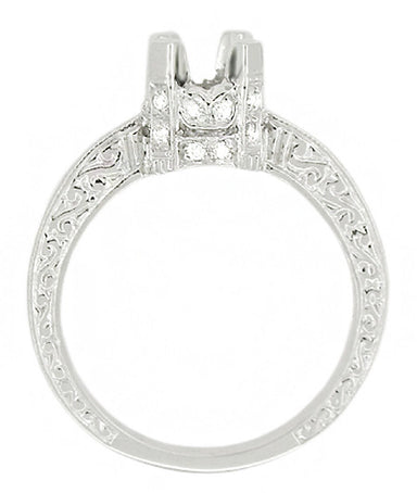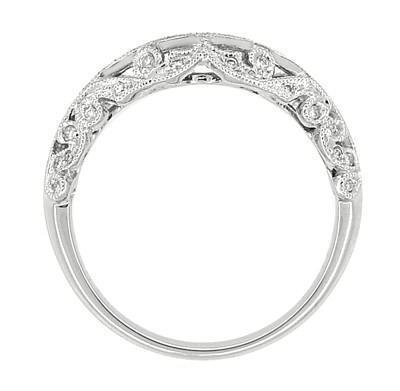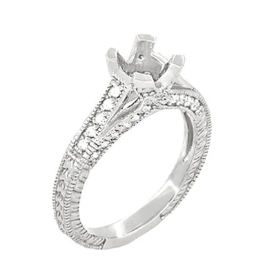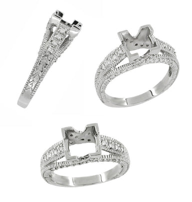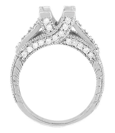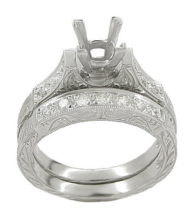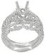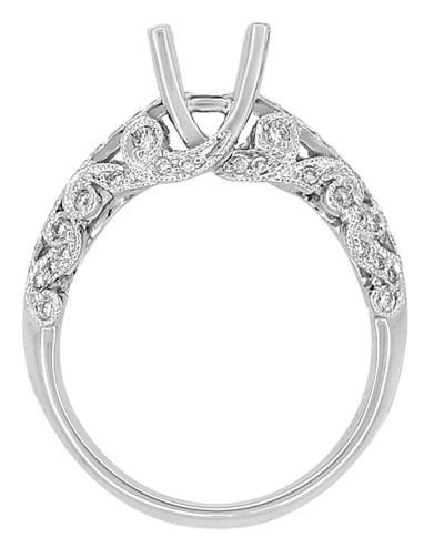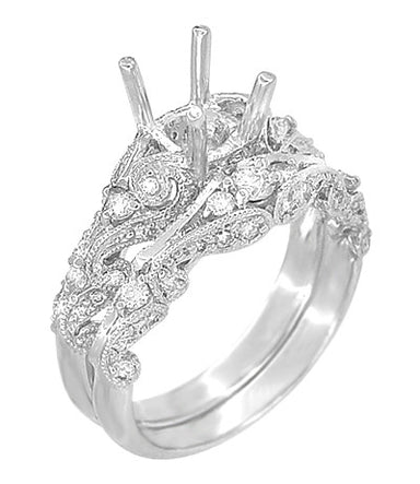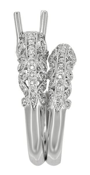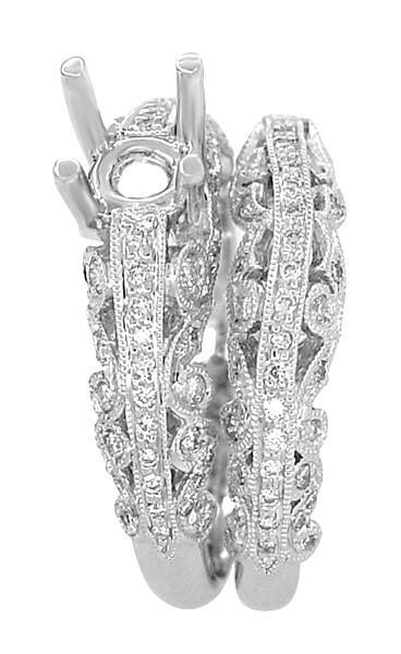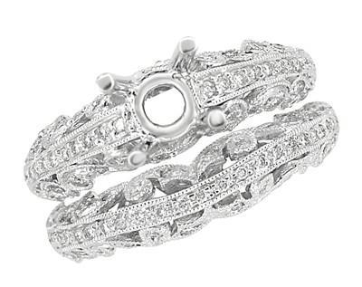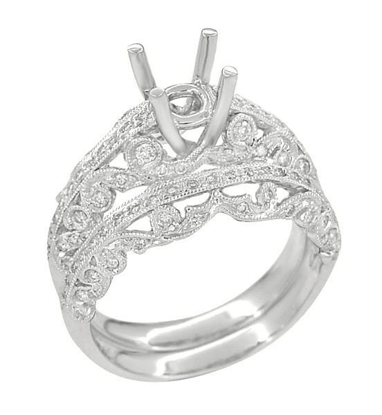 Certain to attract a lifetime of attention, this exquisite antique style 18K white gold filigree wedding ring set features a 4 prong trellis style engagement ring setting with 62 shimmering diamonds beautifully set into an ornate scroll design. This elaborate woven pattern of diamonds totals 0.28 carat total diamond weight for the engagement ring setting.