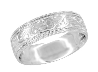 The matching filigree wedding ring features 33 shimmering diamonds set in the same lavish scroll design for 0.34 carat total diamond weight for the wedding ring. Shimmery beaded millgrain finishes the lavish design of this exquisite heirloom platinum engagement ring and wedding ring set.