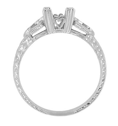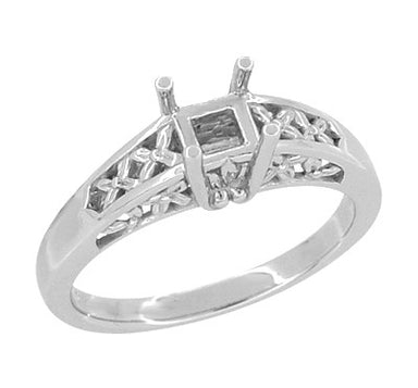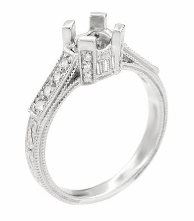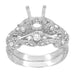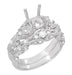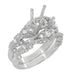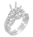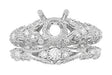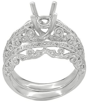 This stunningly unique antique style platinum filigree wedding ring set is sure to forever attract attention as it graces your hand! The 4 prong engagement ring setting features 44 shimmering diamonds beautifully set into an ornate scroll design. This elaborate woven pattern of diamonds totals 0.24 carat total diamond weight for the engagement ring setting.